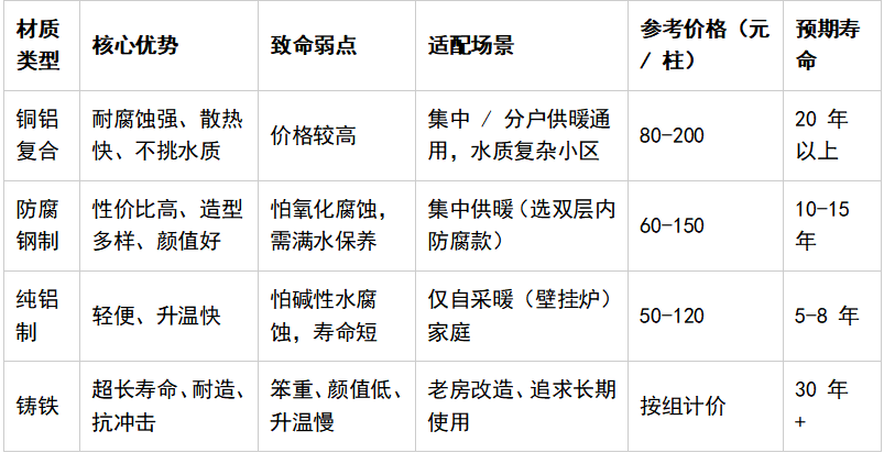 年市場(chǎng)主流材質(zhì)與北京集中供暖特點(diǎn),以下是結(jié)構(gòu)化、可落地的選購(gòu)方案,幫你精準(zhǔn)選到合適產(chǎn)品。