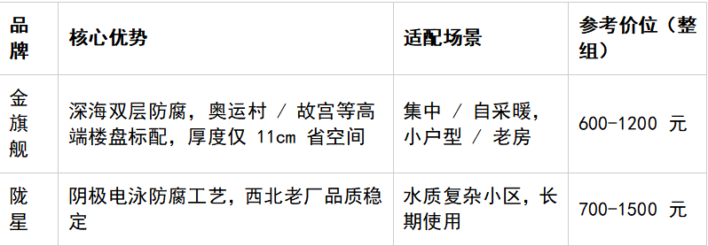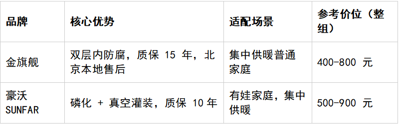 集中供暖:優(yōu)先銅鋁復(fù)合(預(yù)算充足)或雙層內(nèi)防腐鋼制(預(yù)算有限),選北京本地品牌(金旗艦、佛羅倫薩等),找正規(guī)安裝團(tuán)隊(duì)。